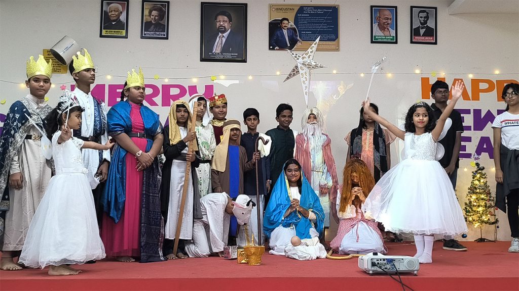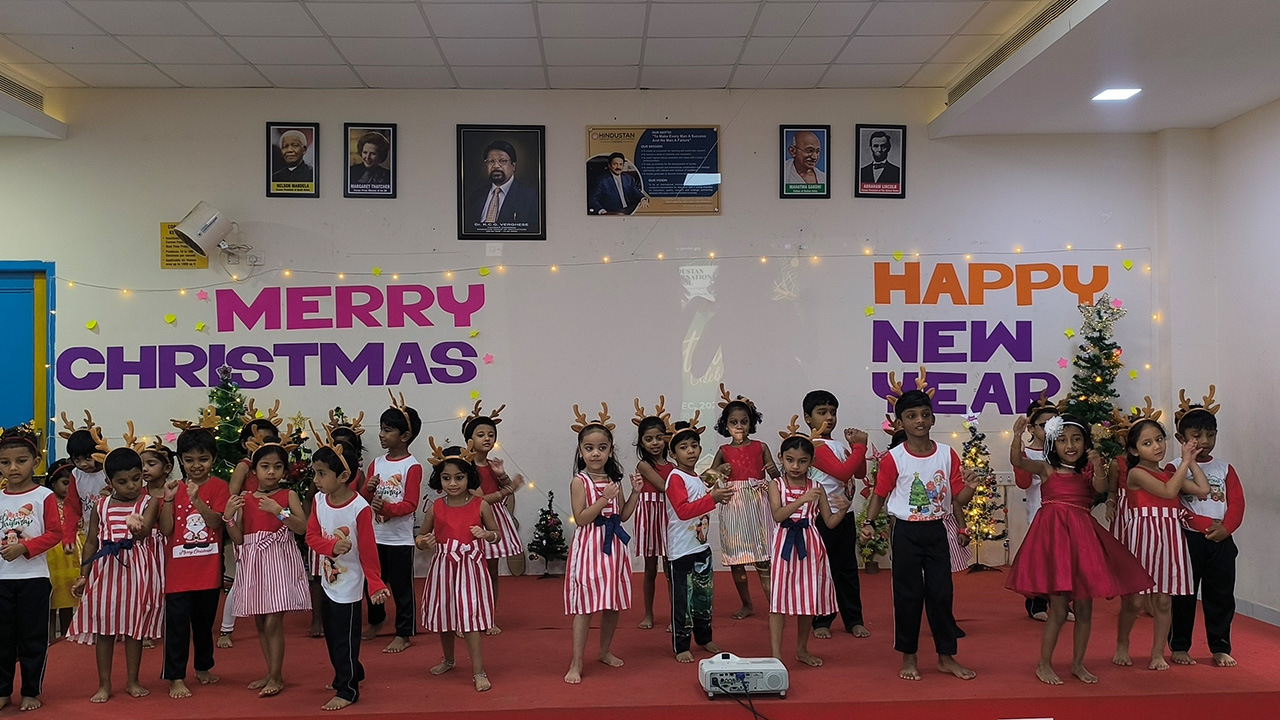 The tiny tots from Kindergarten delighted the audience with an adorable and energetic dance performance. Dressed in colourful festive costumes, the children danced to popular Christmas numbers such as “Let It Snow,” “Gloria,” “Feliz Navidad,” and “Jingle Bells.” Their cheerful expressions and lively movements won loud applause and brought immense joy to everyone present.Students presented a lively and energetic Christmas dance that filled the hall with joy and enthusiasm. The performance showcased creativity, coordination, and the festive spirit of the season.Melodious Christmas carols were sung by students, spreading messages of hope, love, and unity. The harmonious voices and familiar tunes created a heartwarming ambience and encouraged audience participation.The highlight of the celebration was the Nativity Skit, which beautifully depicted the birth of Jesus Christ. Through expressive acting and meaningful narration, students conveyed the values of humility, kindness, and compassion that lie at the heart of Christmas.The Christmas celebration was a memorable and meaningful experience for everyone present. It not only brought festive cheer but also reinforced important values such as love, generosity, and togetherness. The enthusiastic participation of students and the coordinated efforts of teachers made the event a grand success.