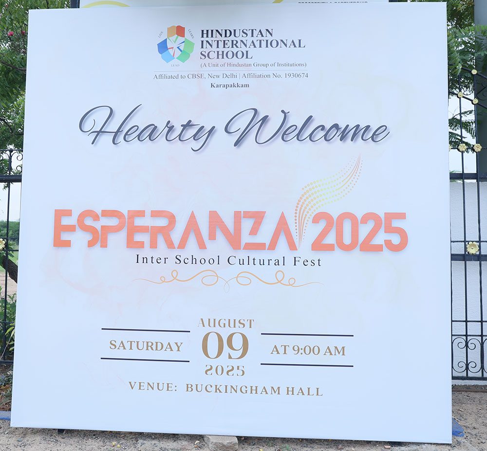 Hindustan International School, Karapakkam was a vibrant hub of colour, energy, and creativity as it hosted its much-anticipated inter-school cultural fest, Esperanza 2025–26, on Saturday, 9th August 2025. The event brought together students from some of Chennai’s most reputed schools, including SAN Academy, VELS International, KC High School, APL Global School, and Hindustan’s own Padur and Guindy campuses, among others.