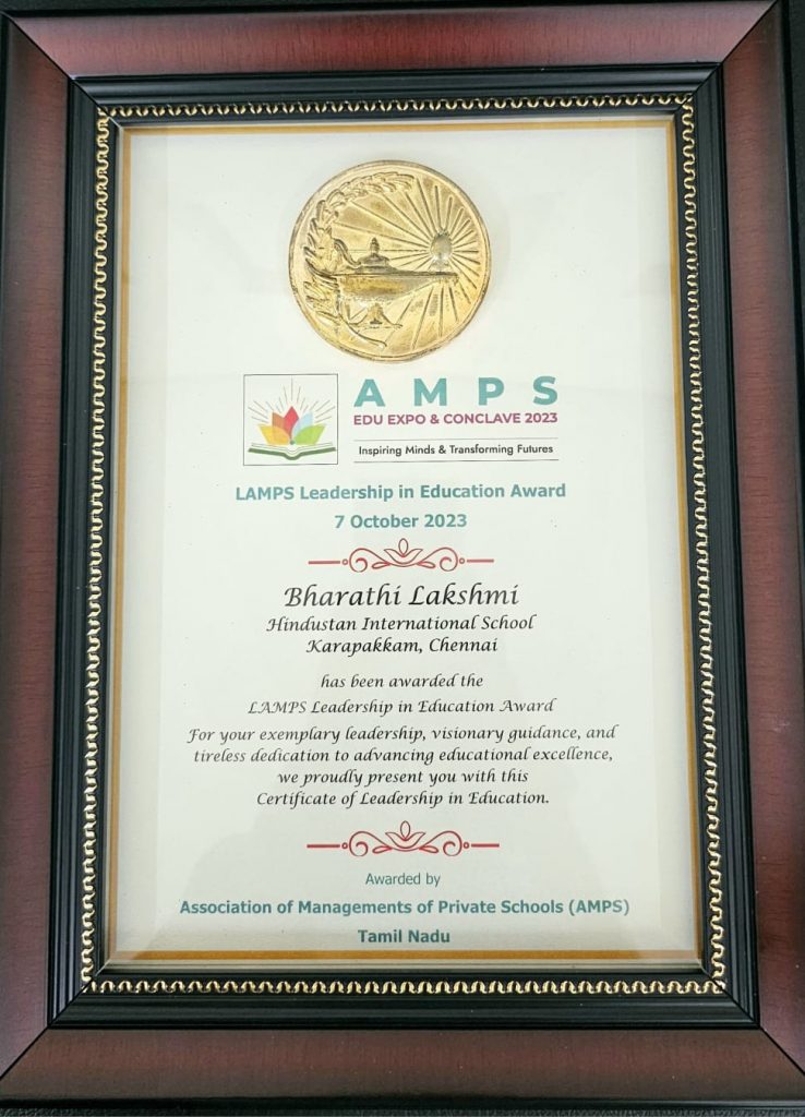 Principal , Ms Bharathi Lakshmi was awarded the ” LAMPS Leadership in Education ” by the Association of Management of Private Schools at the AMPS Edu Exp & Conclave 2023 on 07 October .