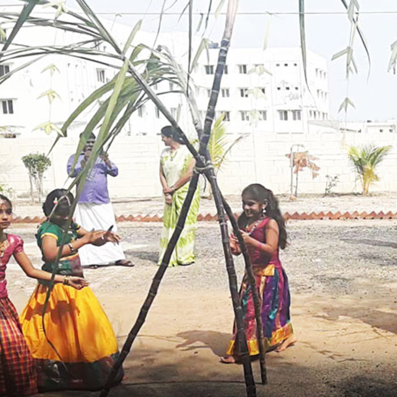 Pongal Celebrations 2017 at HindustanInternationalSchool Karapakkam was an extraordinary day with a typical village Pongal celebration. The halls and reception were adorned with flowers and thoranam, sugarcane stacked to grace the occasion. The day started off with a tamil speech on Pongal, an exclusive villupaatu by the teachers of the school and a pongal-themed tamil song beautifully sung by the students. Girls gracefully danced for a Kummiadi Song around the Pongal pot. An earthen pot was placed on fire with traditional fanfare. The chanting of Pongalo! Pongal! Pongalo! Pongal was exciting for the children. Sweet Pongal was made and cows and goats were fed bananas. Every moment was enriching for the kids who were able to experience typical Pongal celebrations firsthand. Folk singers Tamil Isaipannar Sellangkuppam M. Subramaniyan and crew performed many folk songs with Instruments and entertained the kids. Children went on bullock cart rides, played Uriyadi and had sweet Pongal and sugarcane to end the day with many fond memories…