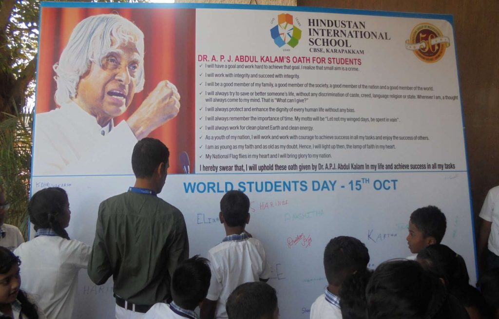 Teachers, students and staff at #HindustanInternationalSchool #Karapakkam celebrated APJ Abdul Kalam’s 80th Birth Anniversary as World Student’s Day as declared by the United Nations. His love for students were through words of advice and wisdom. He wanted to be remembered a teacher. He promoted education for every child and insisted every child to dream big. Remembering his words, we took an oath on the 17th Monday, and signed it.